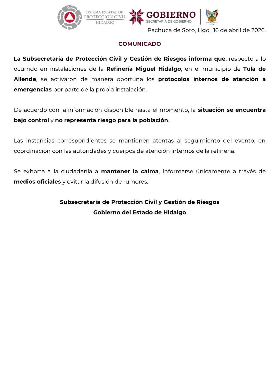 Autoridades de Protección Civil informaron que, tras un incidente registrado en la Refinería Miguel Hidalgo, en el municipio de Tula de Allende, se activaron de inmediato los protocolos internos de atención a emergencias.