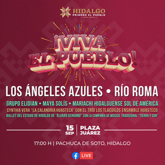 Te esperamos en la Plaza Juárez de Pachuca a partir de las 17:00 horas para el comienzo de un emocionante programa cultural. Luego, disfruta de la música de Río Roma y los Los Ángeles Azules.