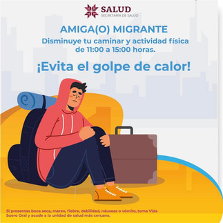 ¡Persona migrante! Evita caminar bajo el sol de 11:00 a 15:00 horas, prevén un golpe de calor. ☀️