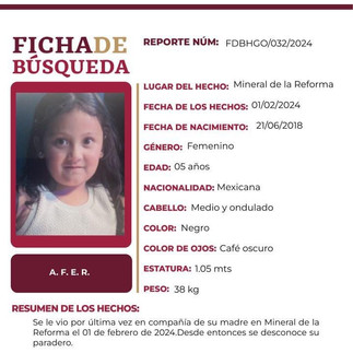 Solicitamos su colaboración para la #DIFUSIÓN de la #FichaDeBúsqueda en favor de A. F. E. R., quién fue vista por última vez en compañía de su madre en #Mineral de la Reforma, el 01 de febrero de 2024. Desde entonces se desconoce su paradero